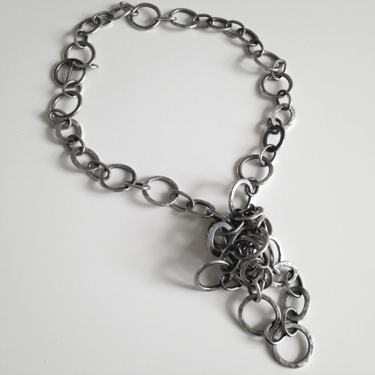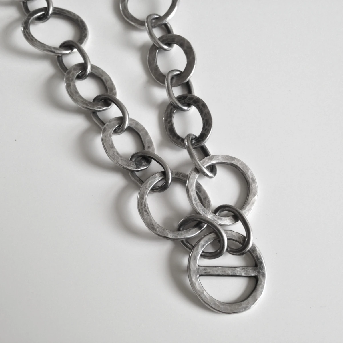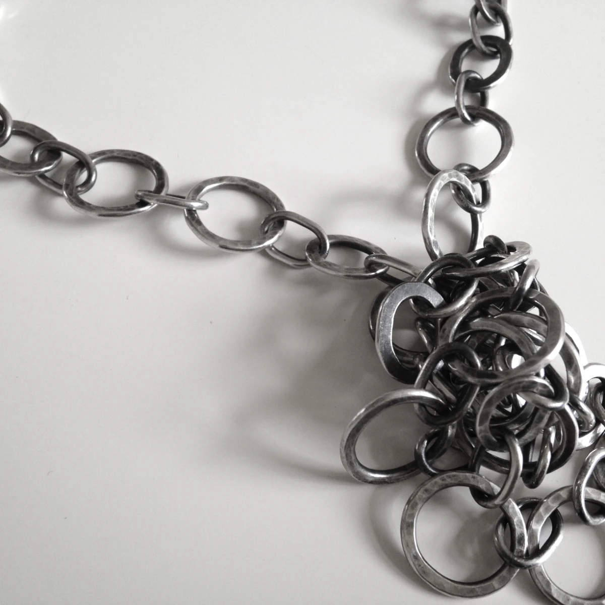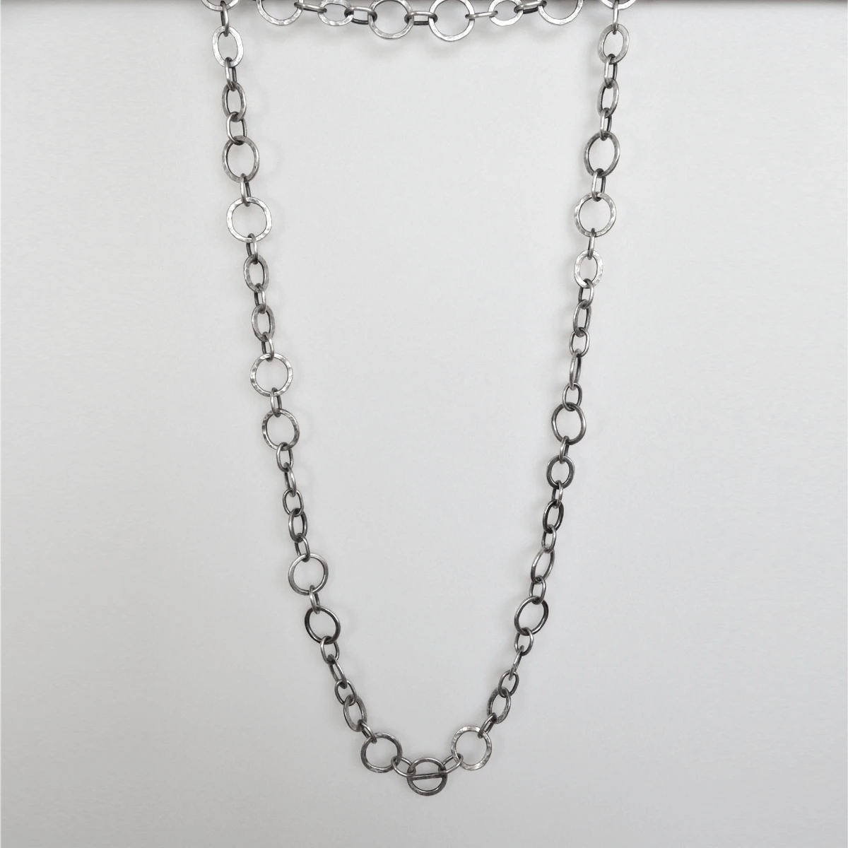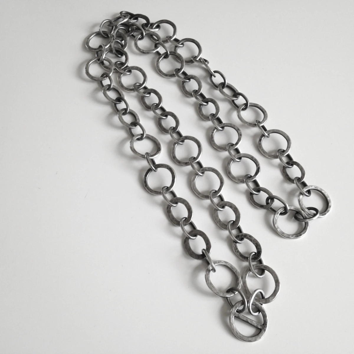 heavy gauge sterling silver jump rings soldered to create a custom chain approximately 81cm/32" long, textured and oxidized