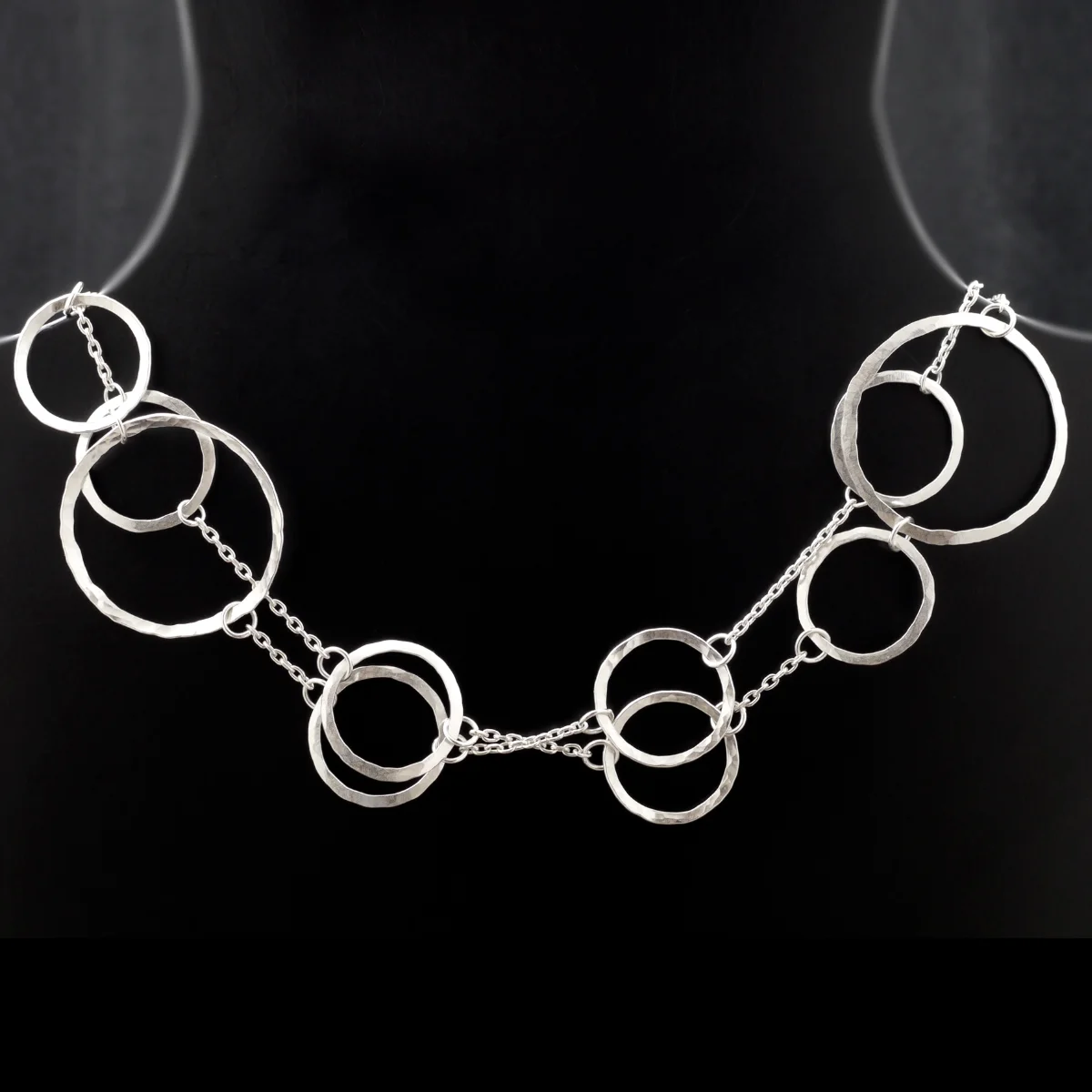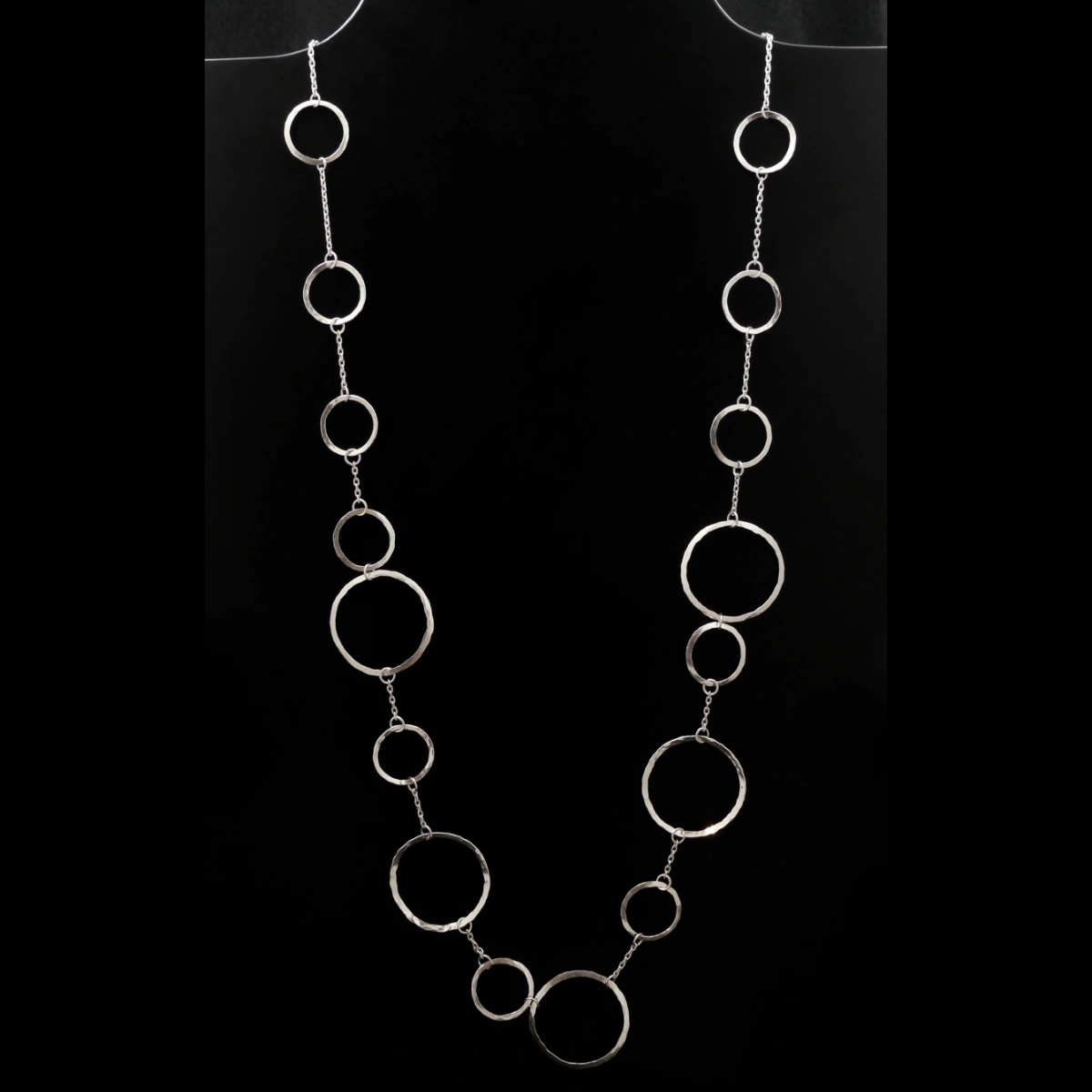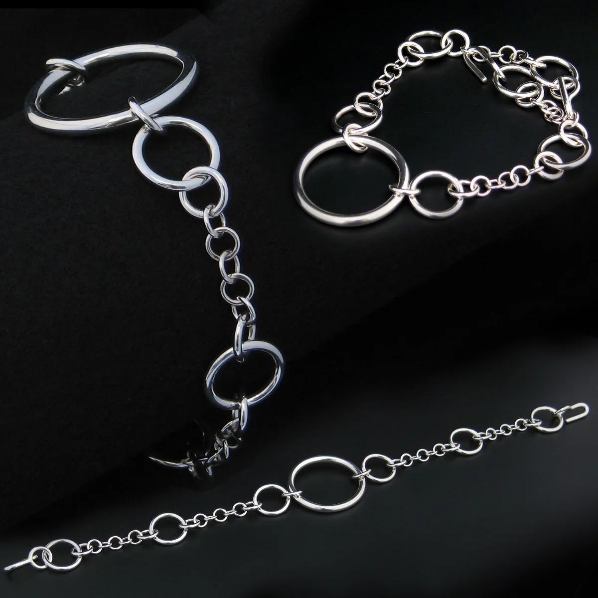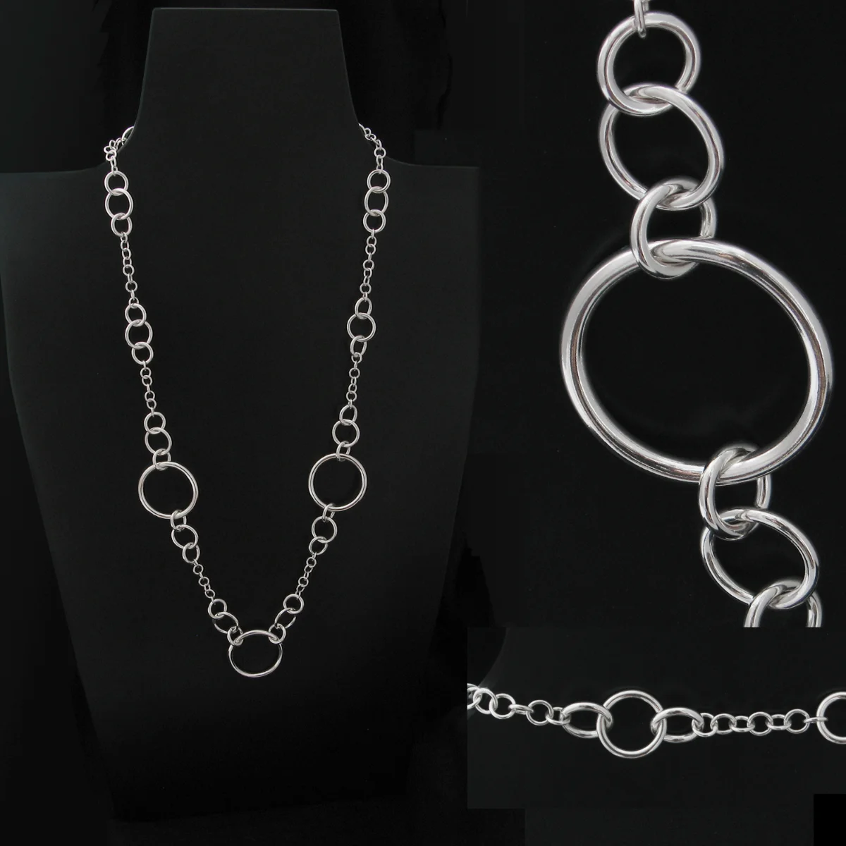 heavy gauge sterling silver jump rings and/or wire stock in combination with medium gauge cable chain, soldered to create custom chains approximately 81cm/32" long