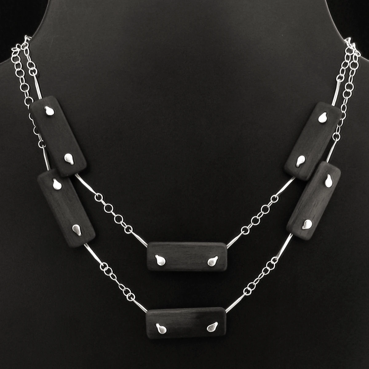 necklace: rounded ebony rectangles, pierced and connected with sterling wire to medium round cable chain
