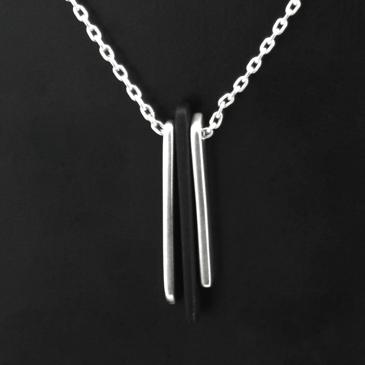 pendant: 2 slices of silver and 1 slice of ebony strung on a small medium gauge cable chain. slices are bout 5 x 40 x 3 mm.