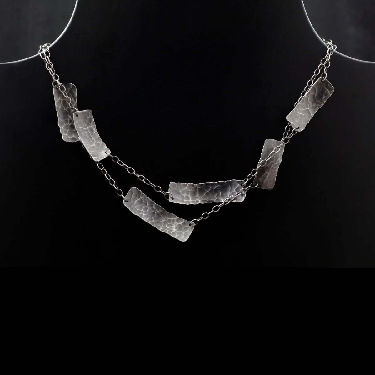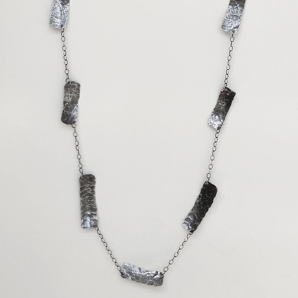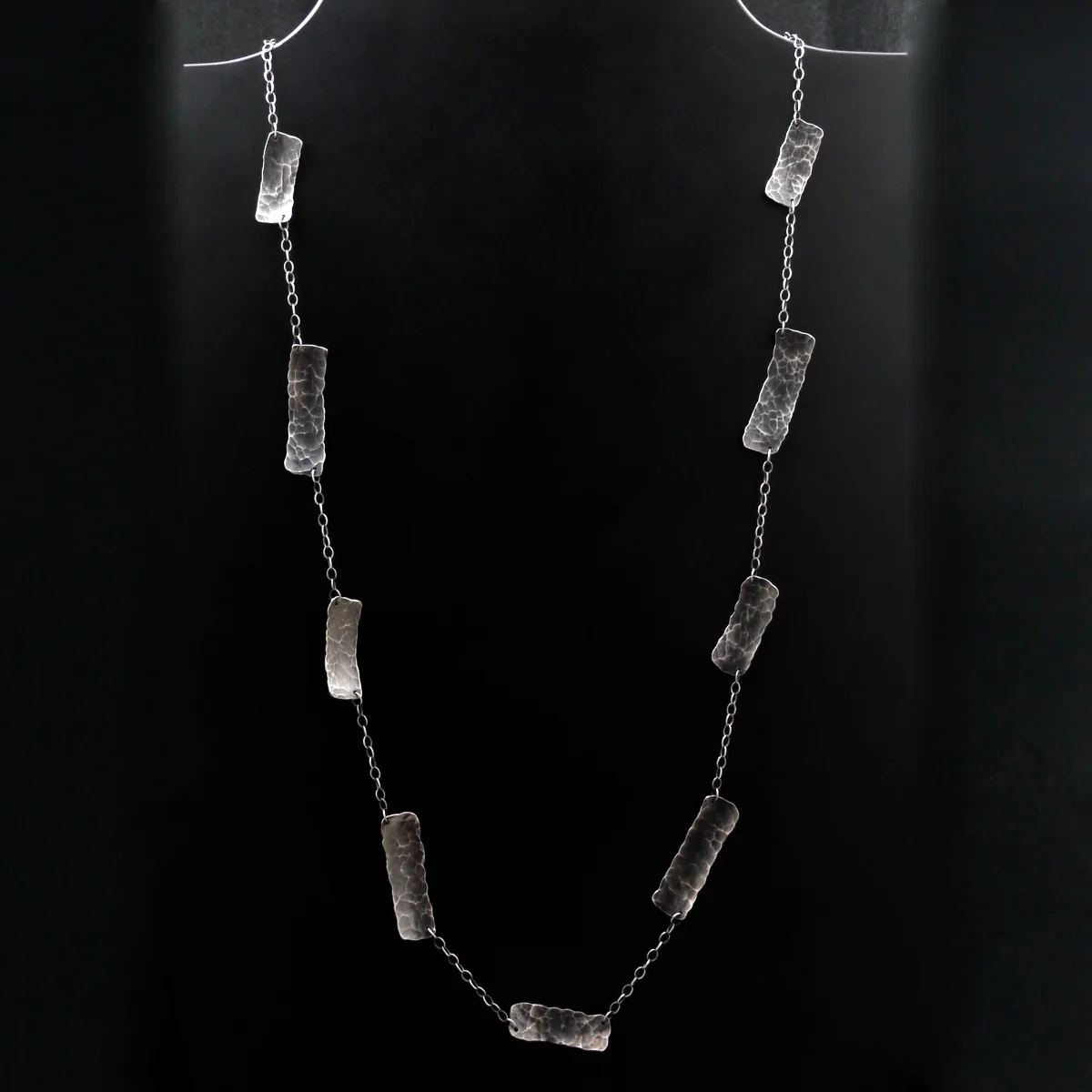 a continued exploration of texturing and oxidizing, 32.5” long with rectangular elements of about 35 x 10mm, with oval lobster clasp.