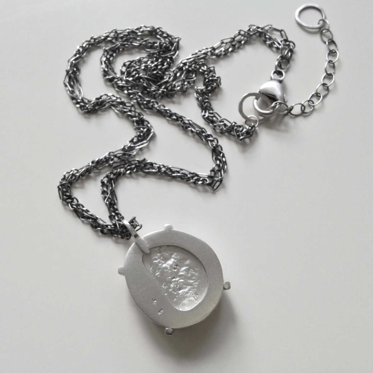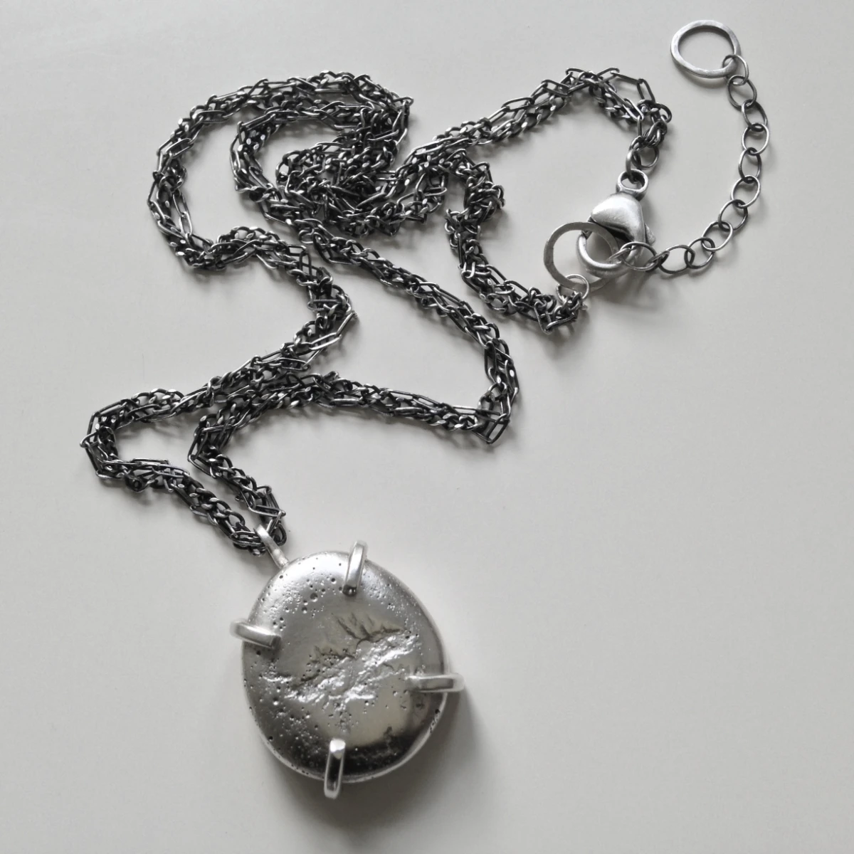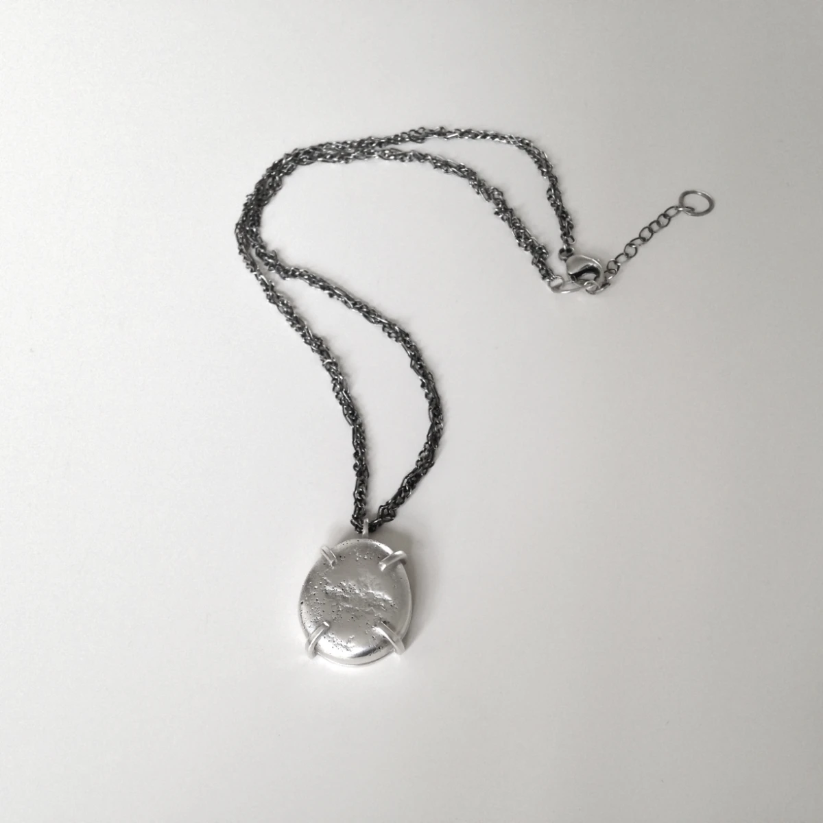 big nugget: 17" long with 2" extender and lobster clasp, multiple strand cable chains braided, Ø 20mm nugget with prong setting, partially oxidized