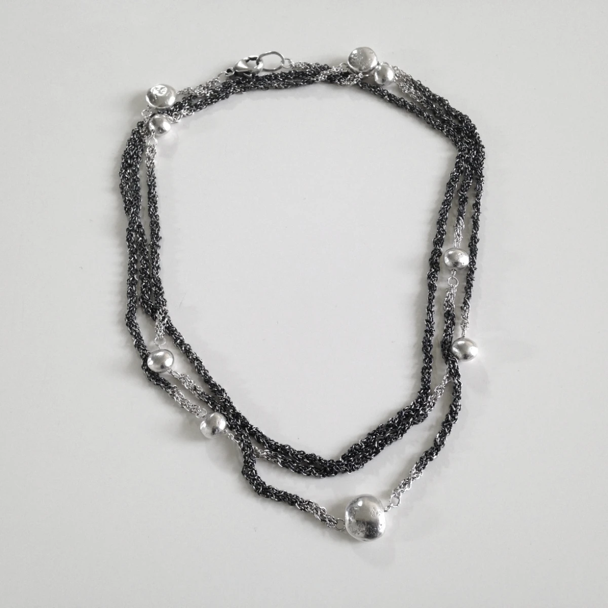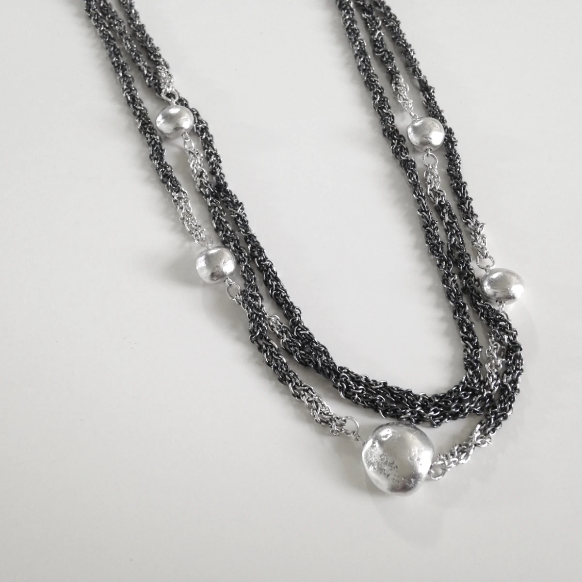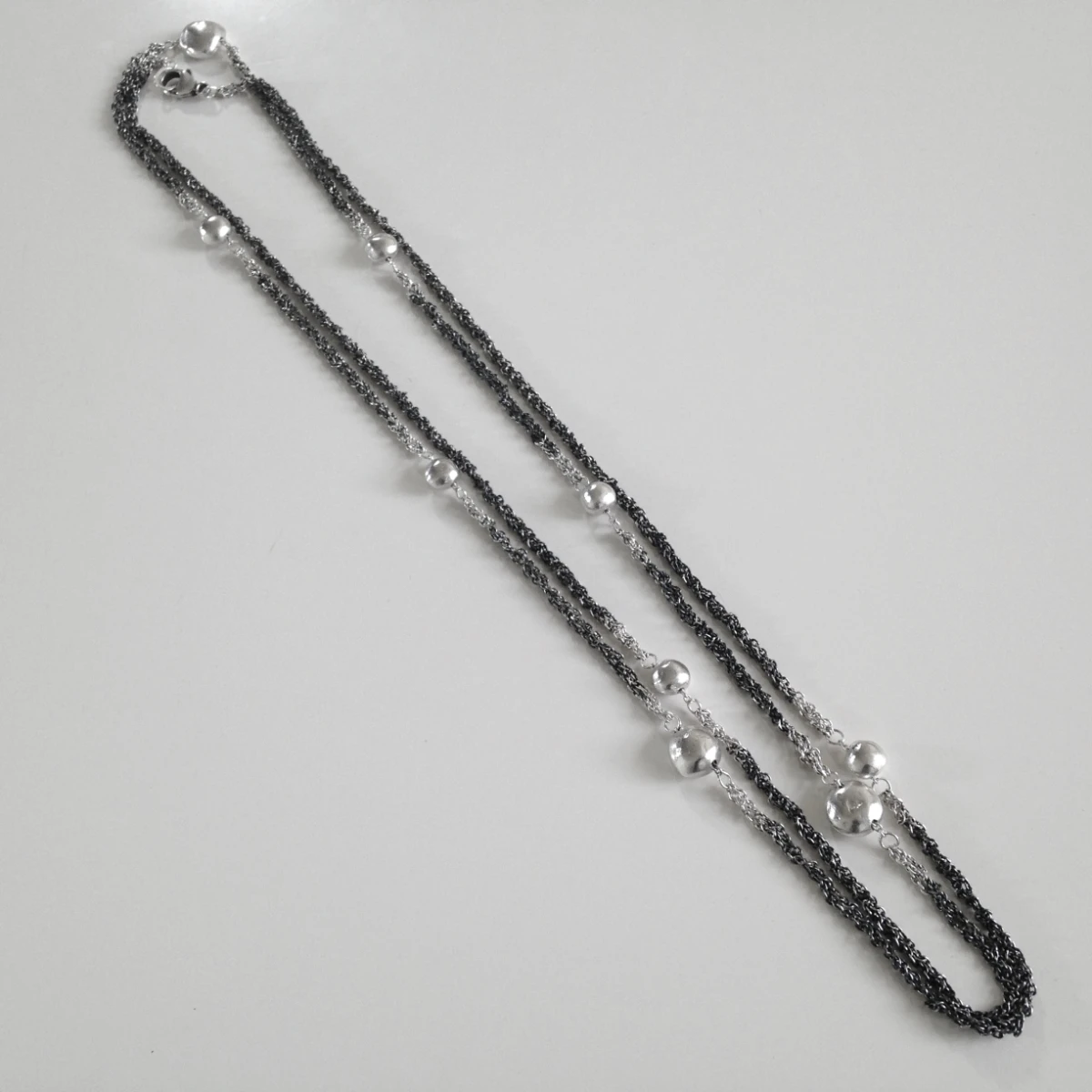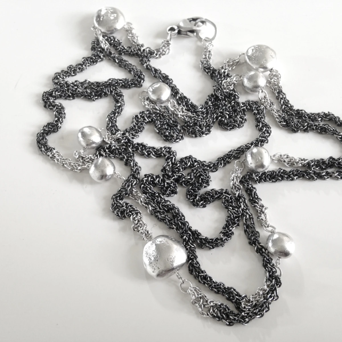 little nuggets: 42 " long with rectangular lobster clasp, multiple strand cable chains braided with nugget beads (about Ø 5-8mm), partially oxidized