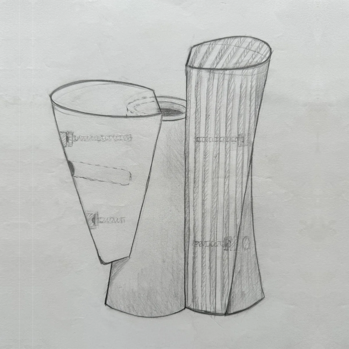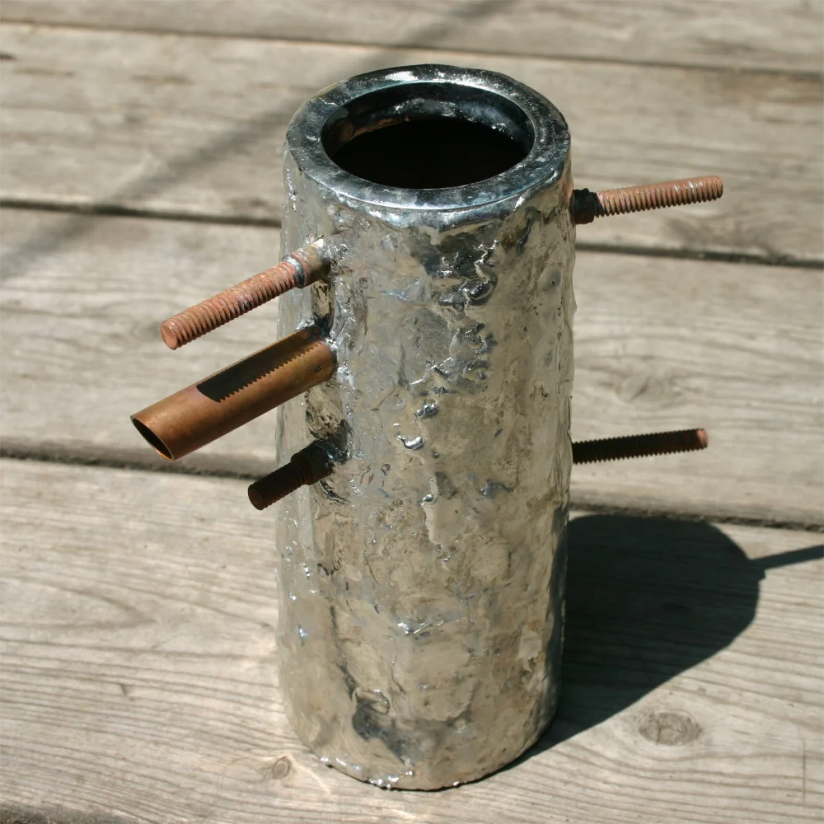 vessel made from an 20 gauge sheet of copper that was bent into cylinder shape and then closed with a solder seam; overall dimensions are about 23 x 18 x 10 cm.
