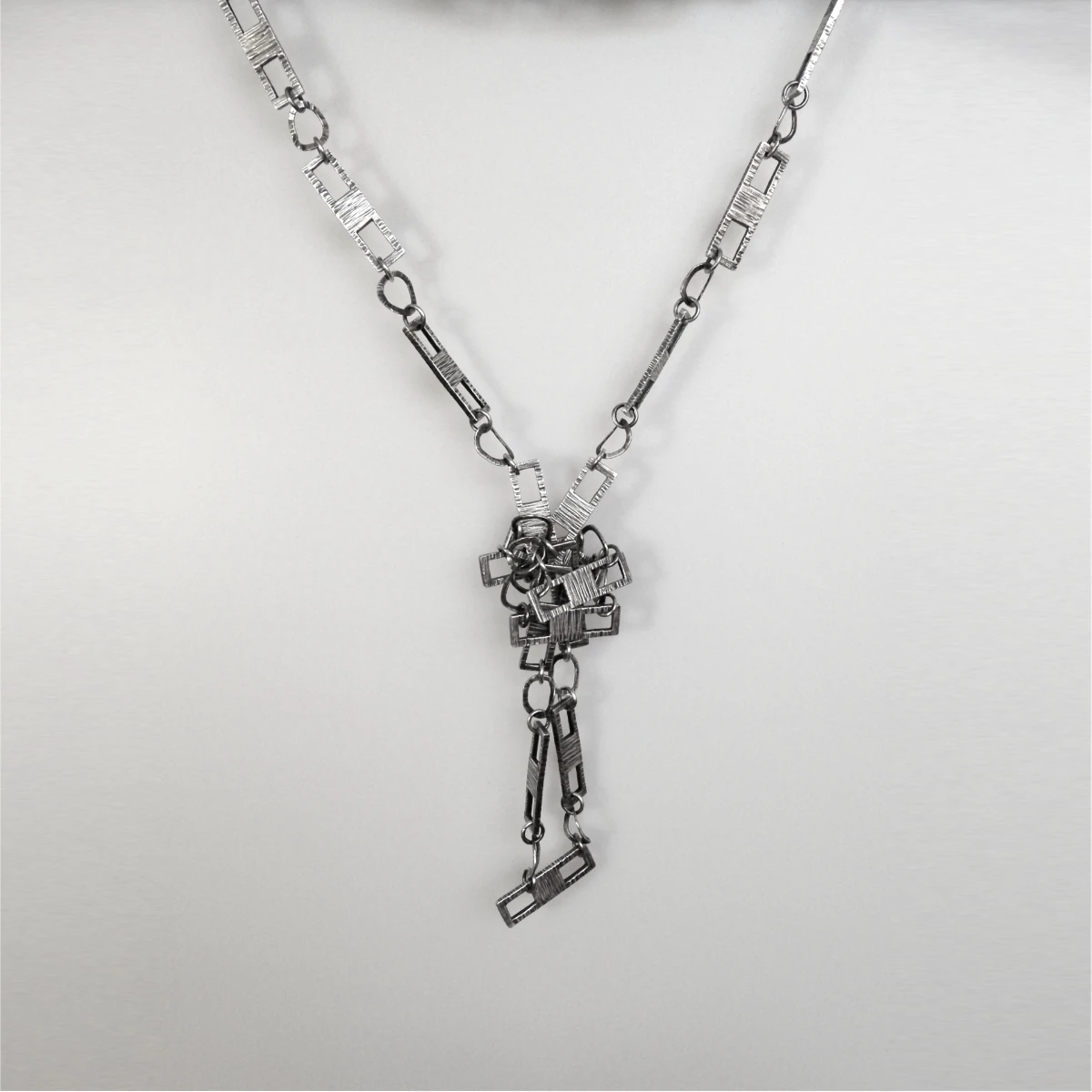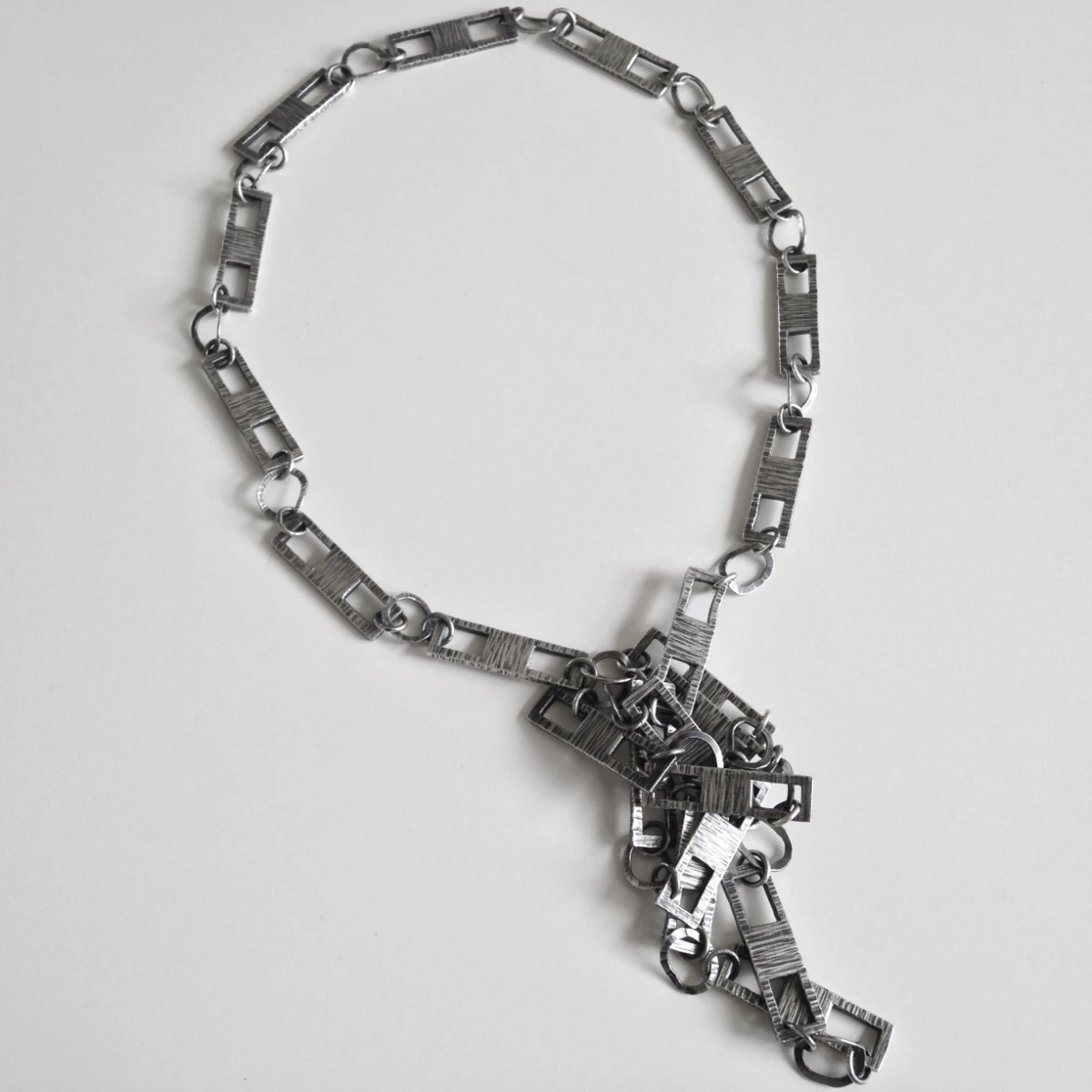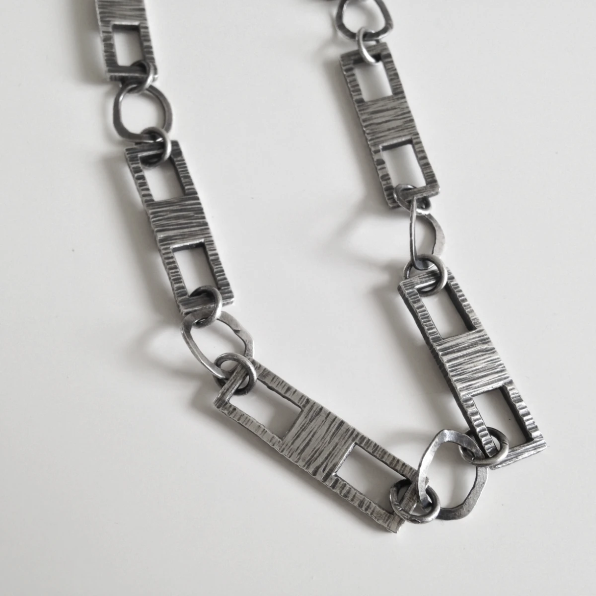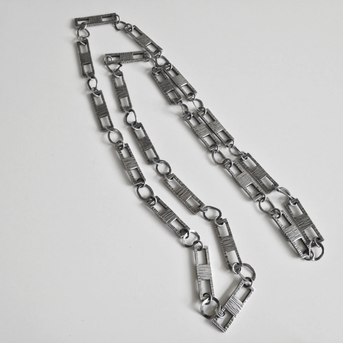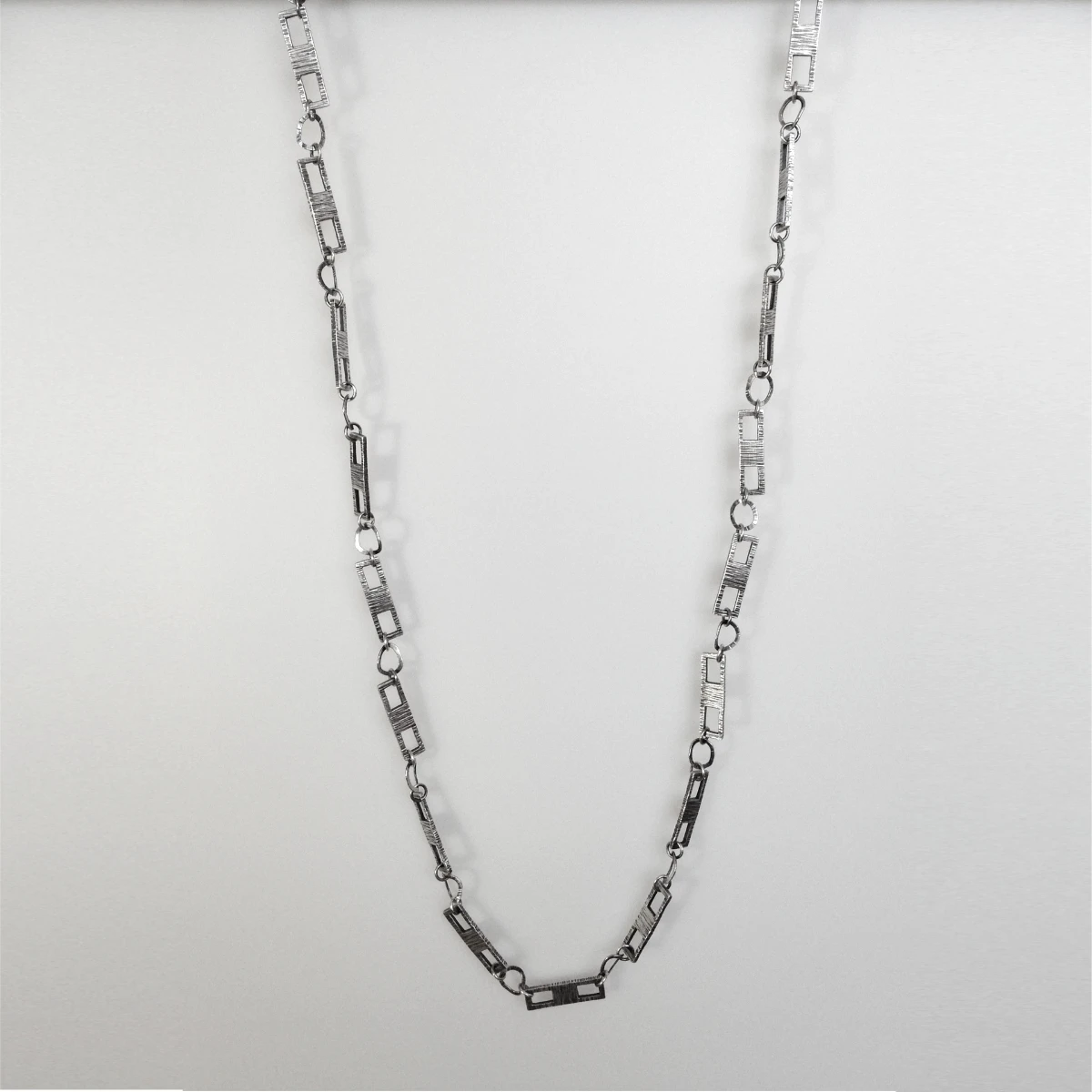 heavy gauge sterling silver sheet stock pieces of 25 x 7mm, pierced, and jump rings soldered to create a custom chain approximately 81cm/32" long, textured and oxidized.
