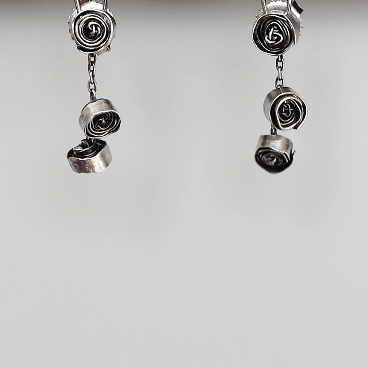 a continued exploration of texturing elements; thin flat wire stock hammered, rolled up around a heavier gauge small cable chain to create 'roses'