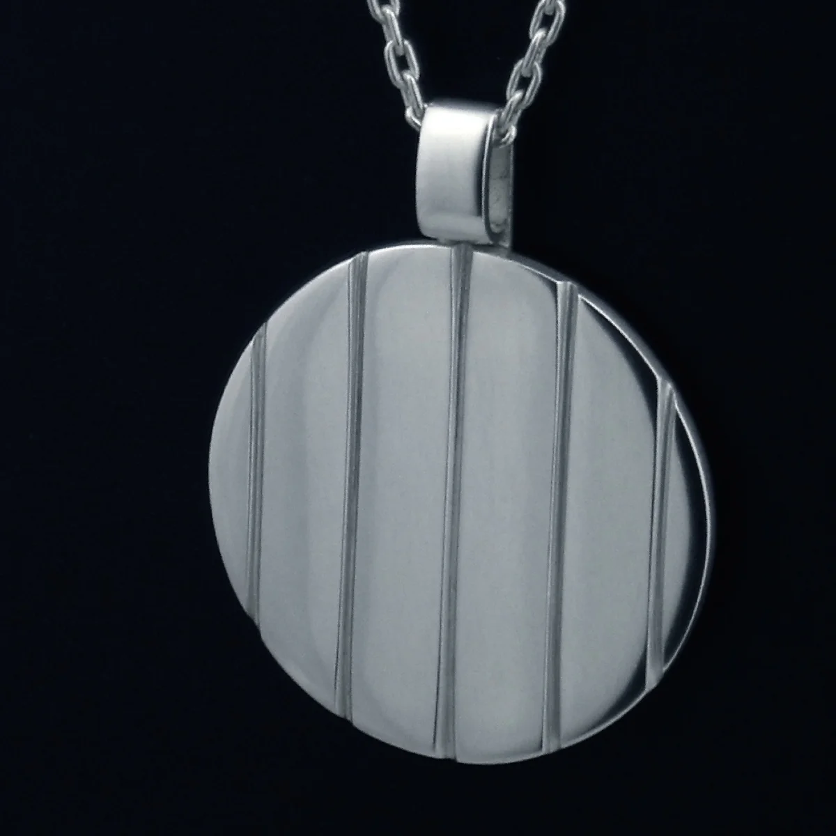 highly polished silver medallion pendant with line carvings, about 4 cm (1.5") in ∅ attached to a small medium gauge cable chain.