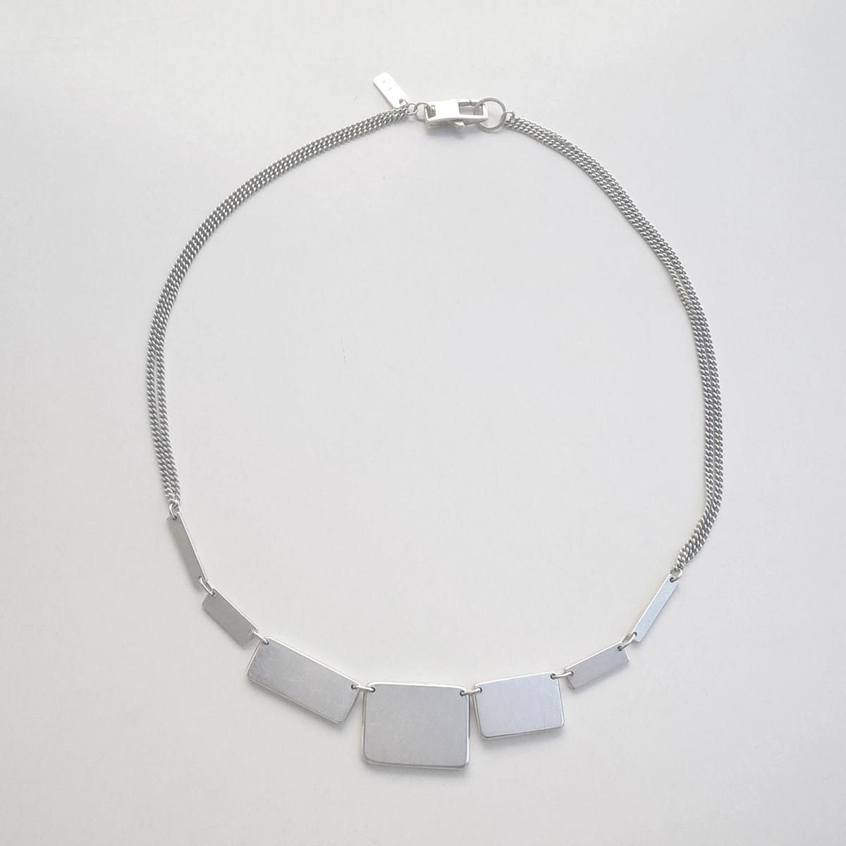 seven solid rectangles: rectangles (1 x 3 x 2cm; 2 x 3 x 1 cm; 2 x 3 x .5 cm and 2 x 3 x .3 cm) attached to a double curb chain with rectangular lobster clasp, 16" long