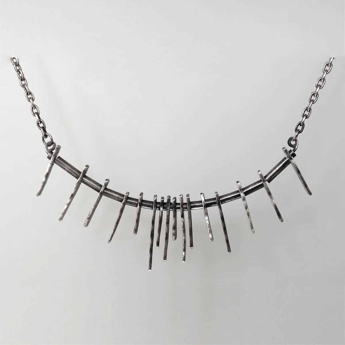 and exploration of texturing and oxidizing sterling: hammered rectangular wire stock strung on wire; using tubing cut to different lengths to achieve desired spacing of the rays; attached to a heavier gauge small cable chain.