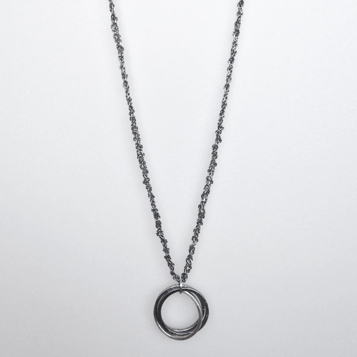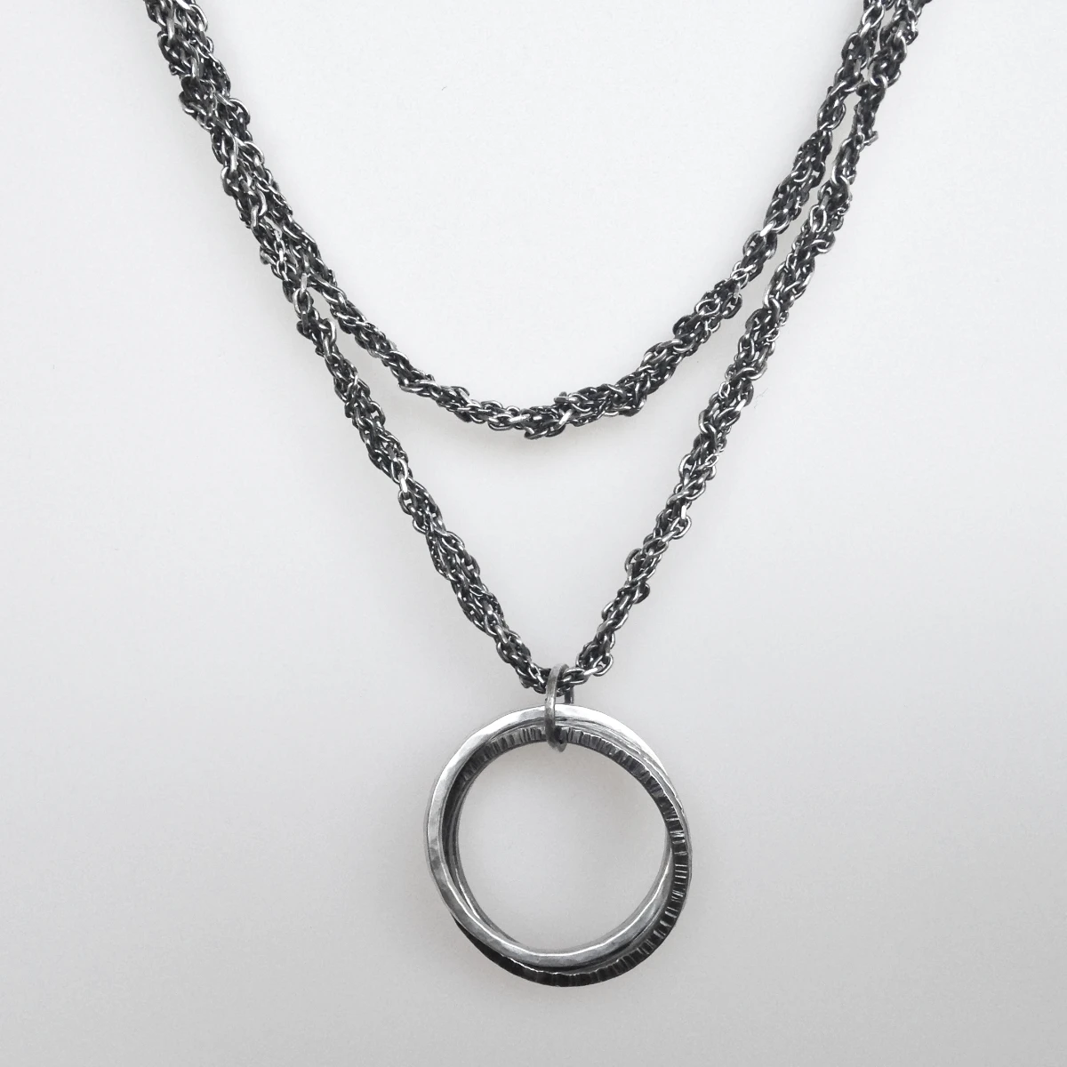 three Ø 32mm textured ring pendants, with braided chain, 29” long, partially oxidized for texture
