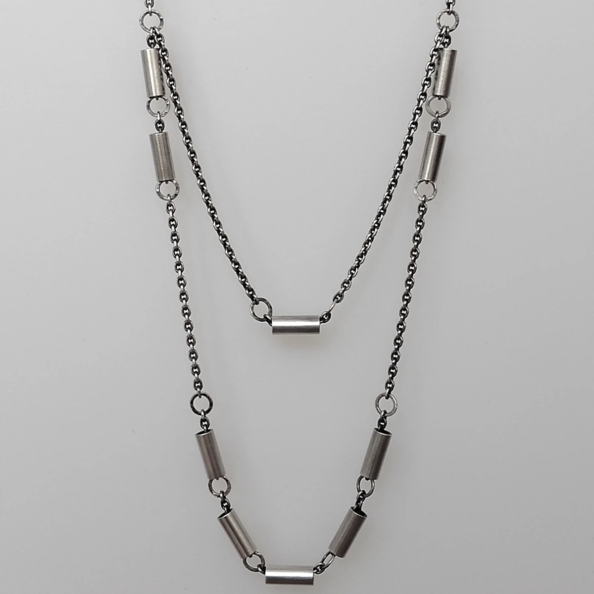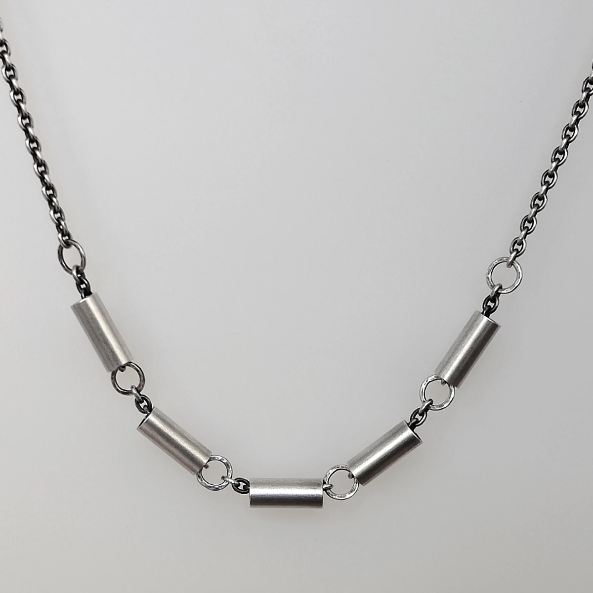 heavy gauge sterling silver tube stock cut to 12mm long tubelets (ø 5mm) and jump rings soldered, textured and oxidized, with rectangular lobster clasps.