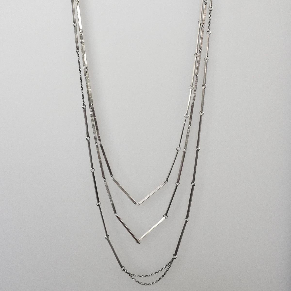 heavy gauge sterling silver sheet stock sawed into strips with saw texture exposed, combined with medium heavy cable chain to create layers of chains approximately 30" long.