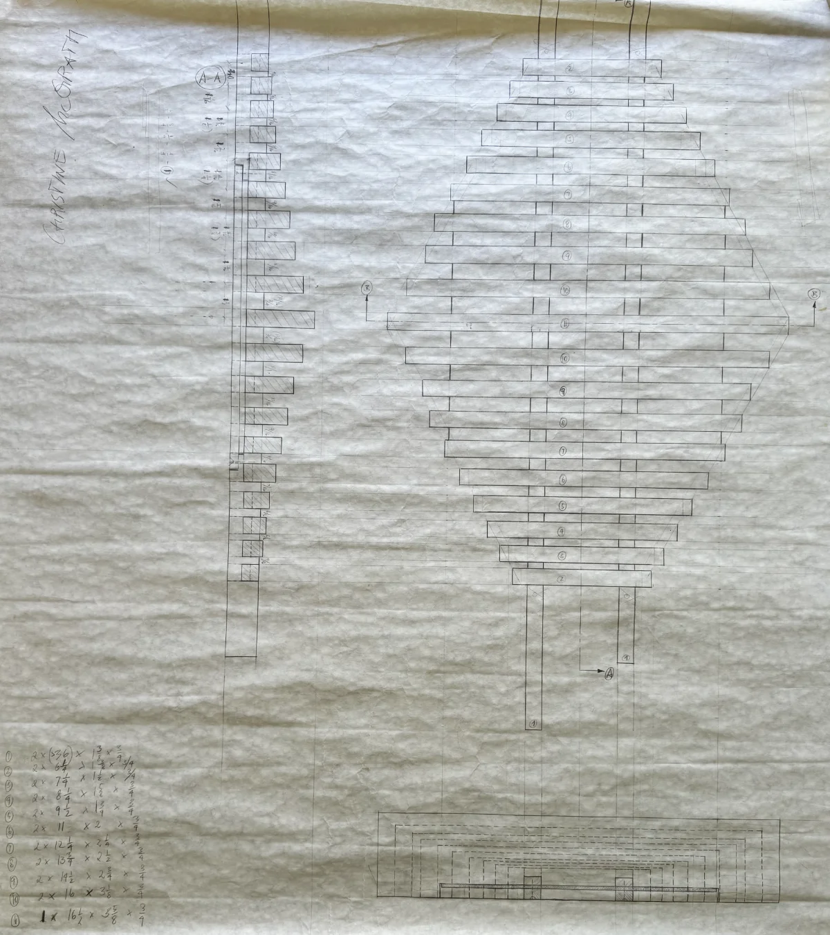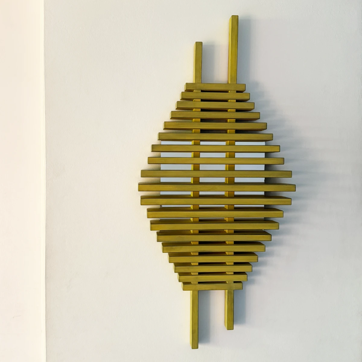 a wood sculpture with mirror, have visible, hidden behind rectangular wood pieces.